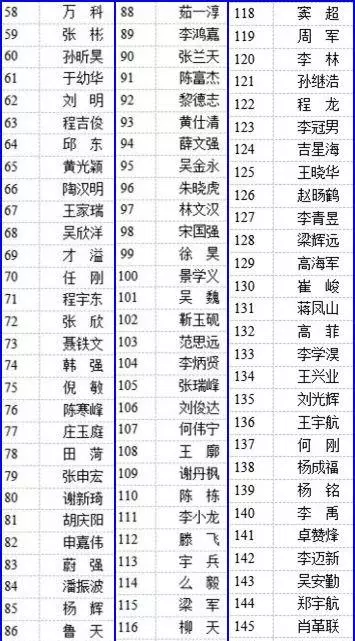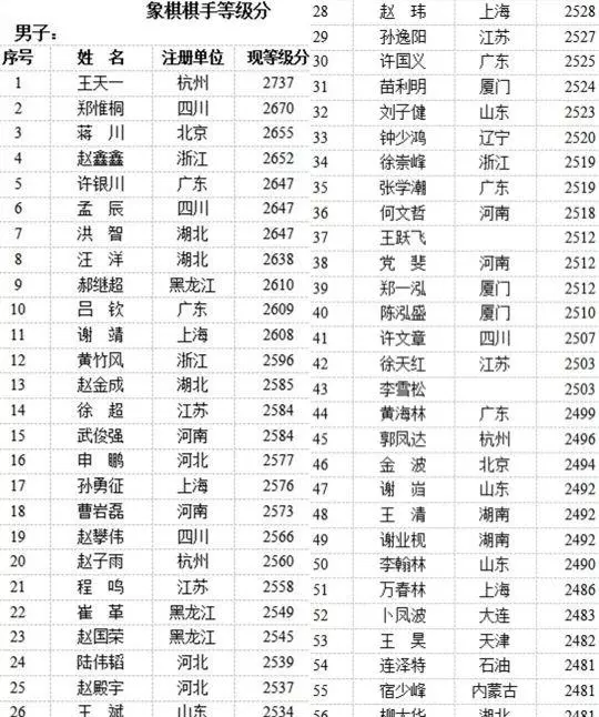 黄竹风、赵金成、徐超、武俊强、申鹏、孙勇征、曹岩磊、赵攀伟、赵子雨第12-20名;程鸣、崔革、赵国荣、陆伟韬、赵殿宇、王斌、李少庚、赵玮、孙逸阳、许国义第21-30名;苗利明、刘子健、钟少鸿、徐崇峰、张学潮、何文哲、王跃飞、党斐、郑一泓、陈泓盛、许文章、徐天红、李雪松第31-43,到此四十三人等级分在2500分之上,男子等级分共有146人上榜。
