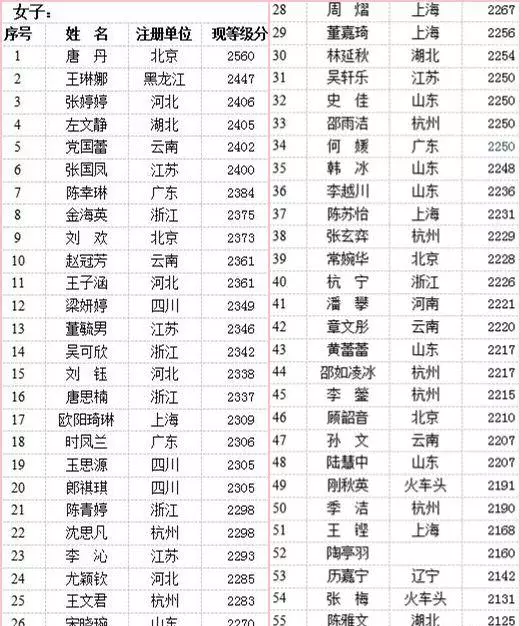 王琳娜、张婷婷、左文静、党国蕾、张国凤、陈幸琳、金海英、刘欢、赵冠芳女子第2-10位;王子涵、梁妍婷、董毓男、吴可欣、刘钰、唐思楠、欧阳琦琳、时凤兰、玉思源、郎祺琪女子第11-20,女棋手二十人的分数高过2300分。