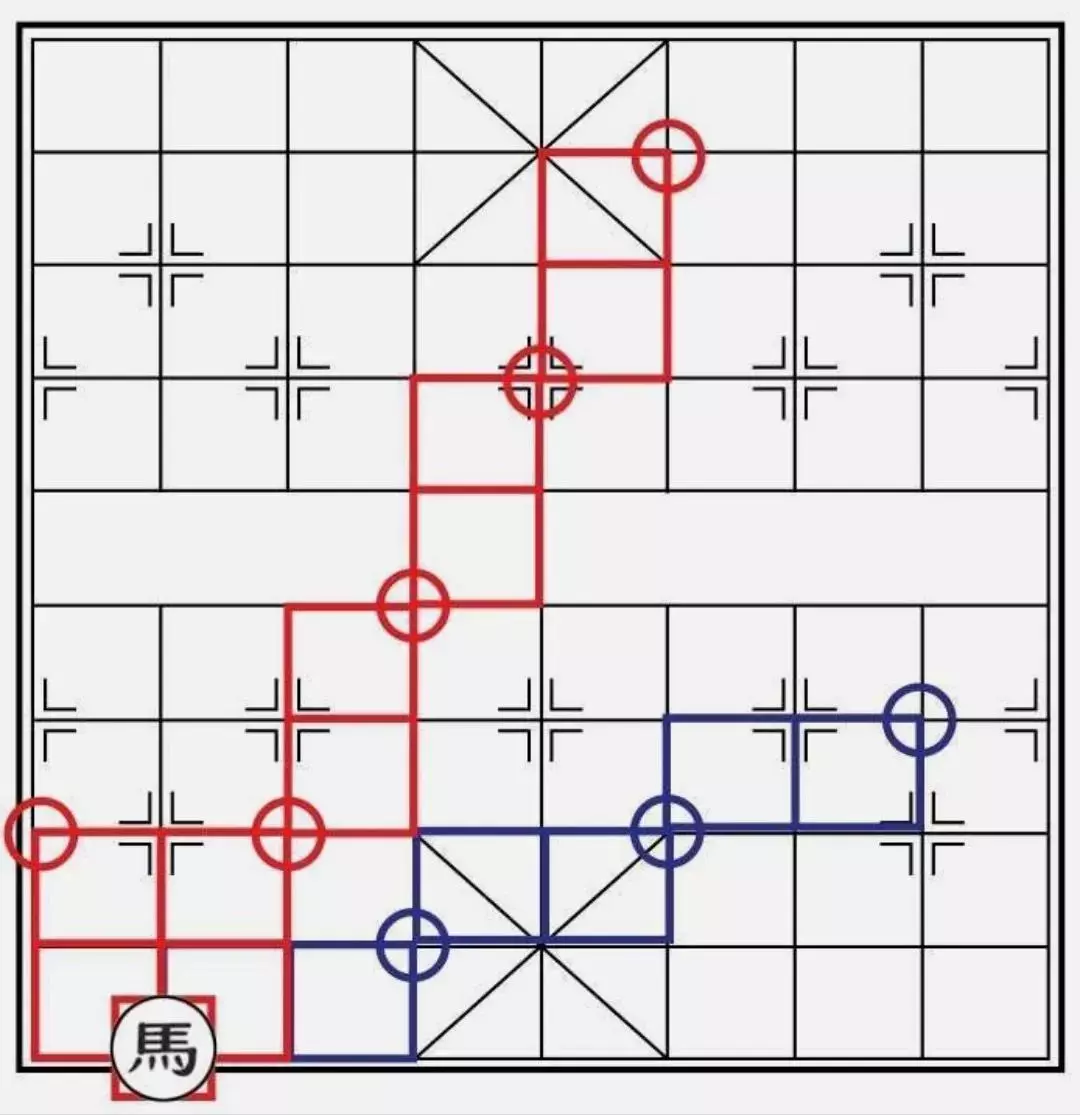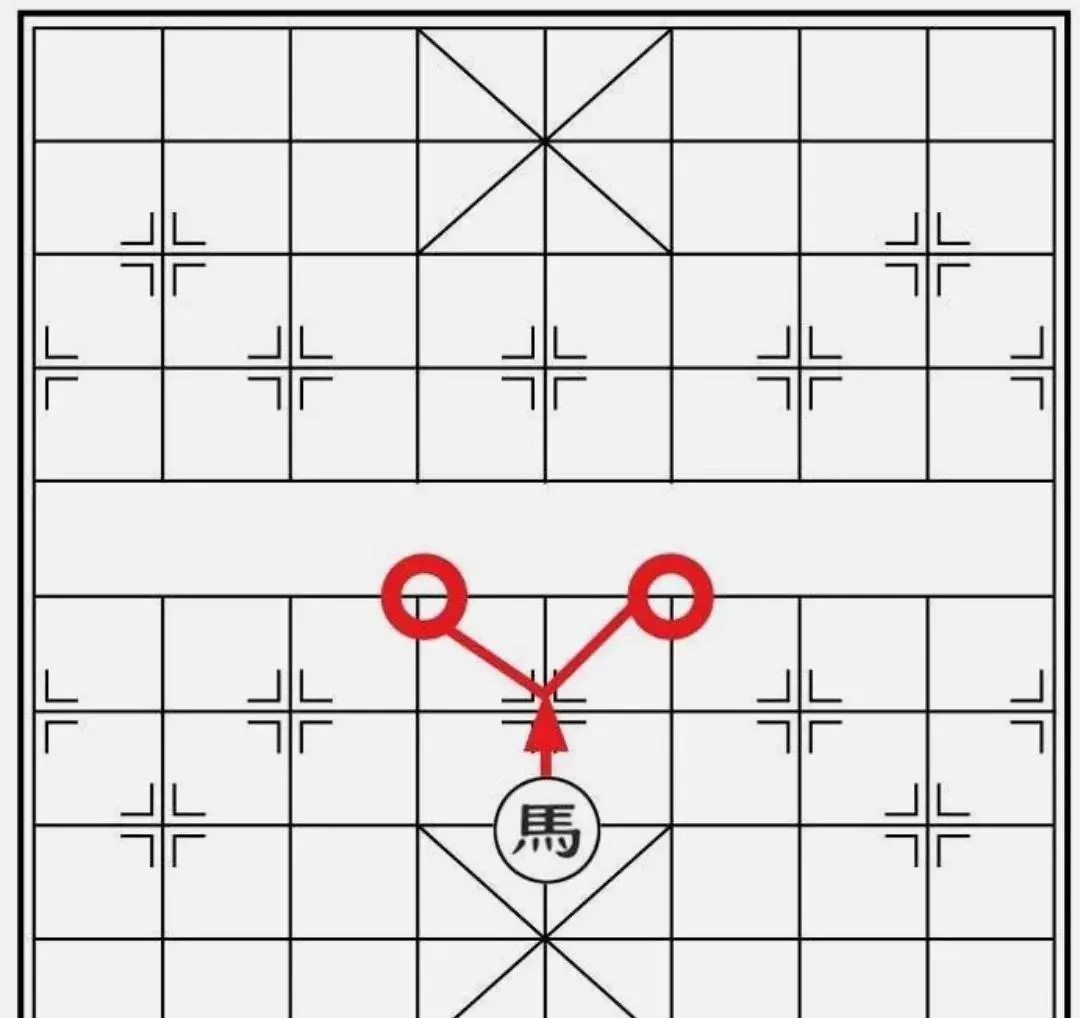 我们知道马走“日”可理解为先依线直走一个交叉点,再斜走一个交叉点。若依线先直走经过的那个点上有一个棋子,则这个棋子不论是黑是红,都算“蹩”住了马向这个方向跳的马腿。