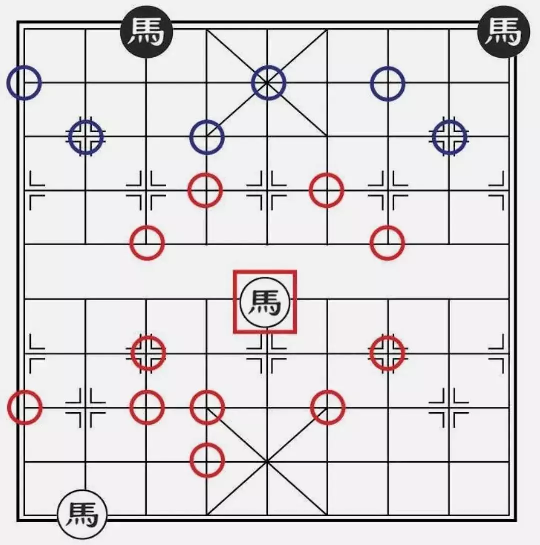 如图4,左下角的红马可以走三个位置,中间的红马可以走八个位置。左上角的黑马可走四个位置,而右上角的黑马只能走两个位置。