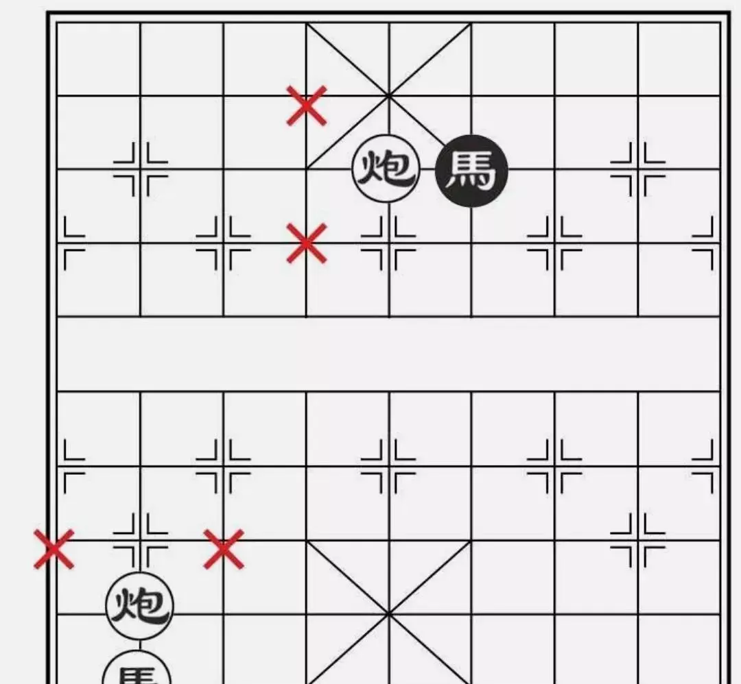 我们一起看看图5上两个马的活动范围。首先看左下角的红马,由于有红炮「蹩马腿」,所以这个红马无法移动到画红叉的位置上,右上角的黑马同样无法走到画红叉的位置上。